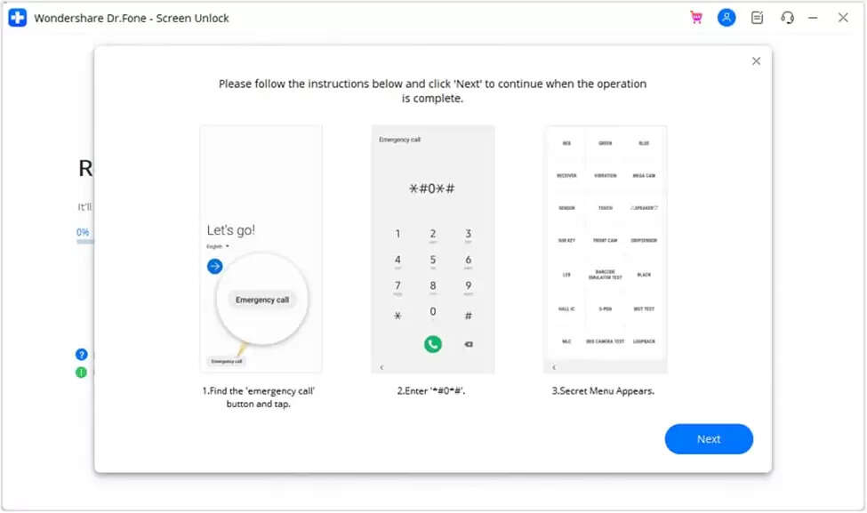 Carefully follow Dr. Fone's guided steps—open the Emergency Call screen, enter *#0*#, allow USB debugging, and confirm authorization.