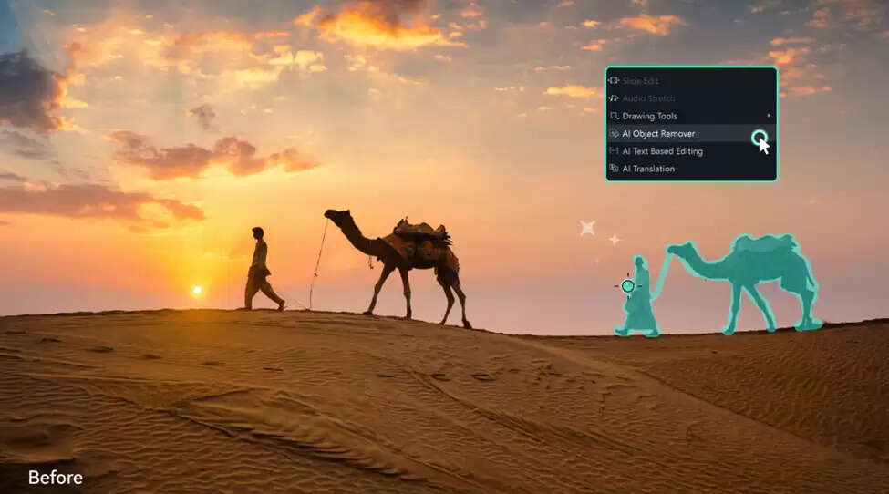 - AI-assisted object removal uses smart analysis instead of manual correction. The tool studies the surrounding frames and fills in what should be there naturally.