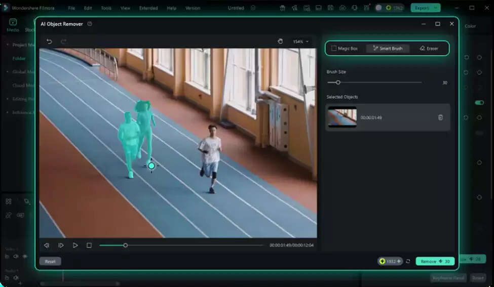 Use the Magic Box or Smart Brush to select the items that you want to delete. If you are using the Smart Brush, change the brush size and color of the area. If you want to correct any edges, then change to the eraser. After that, click Remove to allow the AI to locate and recreate the background.